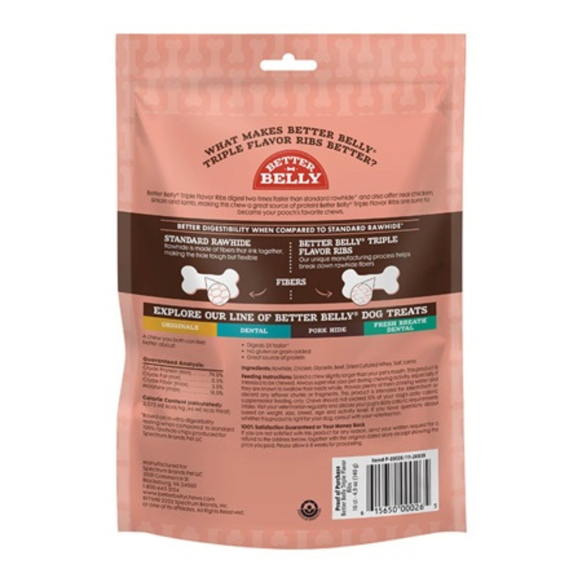 Reward your pup with a treat unlike any other! A great source of protein, Better Belly Triple Flavor Ribs contain three premium flavors - real chicken, sirloin and lamb - for a highly digestible rawhide chew your dog is sure to love. These treats digest two times faster than standard rawhide* thanks to our unique manufacturing process that helps break down rawhide fibers. With no grain or gluten added, and no artificial flavors, preservatives or colors added, Better Belly Triple Flavor Ribs give your pooch a long-lasting chew you both can feel good about.