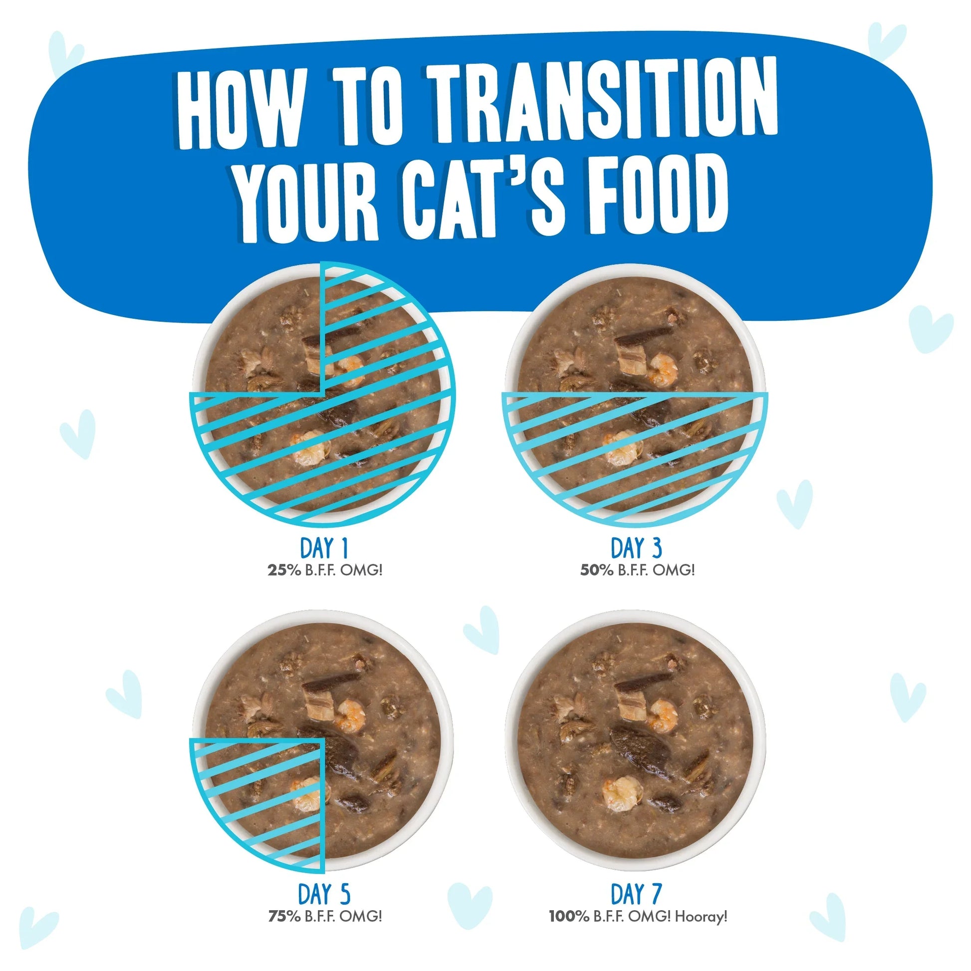 Despite how much your feline friends ask for Weruvas high-quality foods, its best to transition them gradually onto a new food over a week. Start by mixing a small amount of Weruva in with their old food and slowly increase the amount of Weruva fed over 7 days. This will help your kitty to adjust to their new Weruva foods – Because WeLuvya