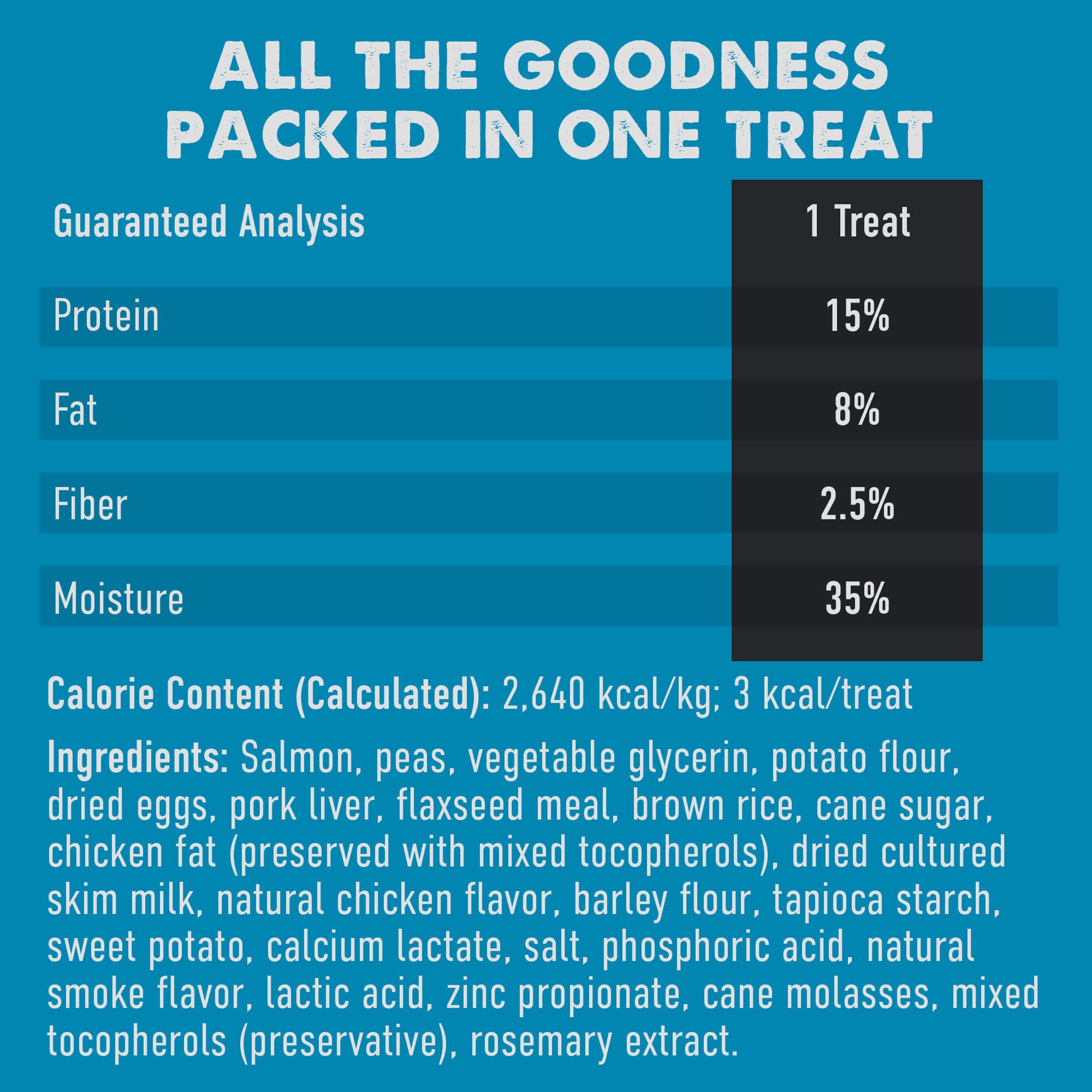 Salmon, peas, vegetable glycerin, potato flour, dried eggs, pork liver, flaxseed meal, brown rice, cane sugar, chicken fat (preserved with mixed tocopherols), dried cultured skim milk, natural chicken flavor, barley flour, tapioca starch, sweet potato, calcium lactate, salt, phosphoric acid, natural smoke flavor, lactic acid, zinc propionate, cane molasses, mixed tocopherols (preservative), rosemary extract.