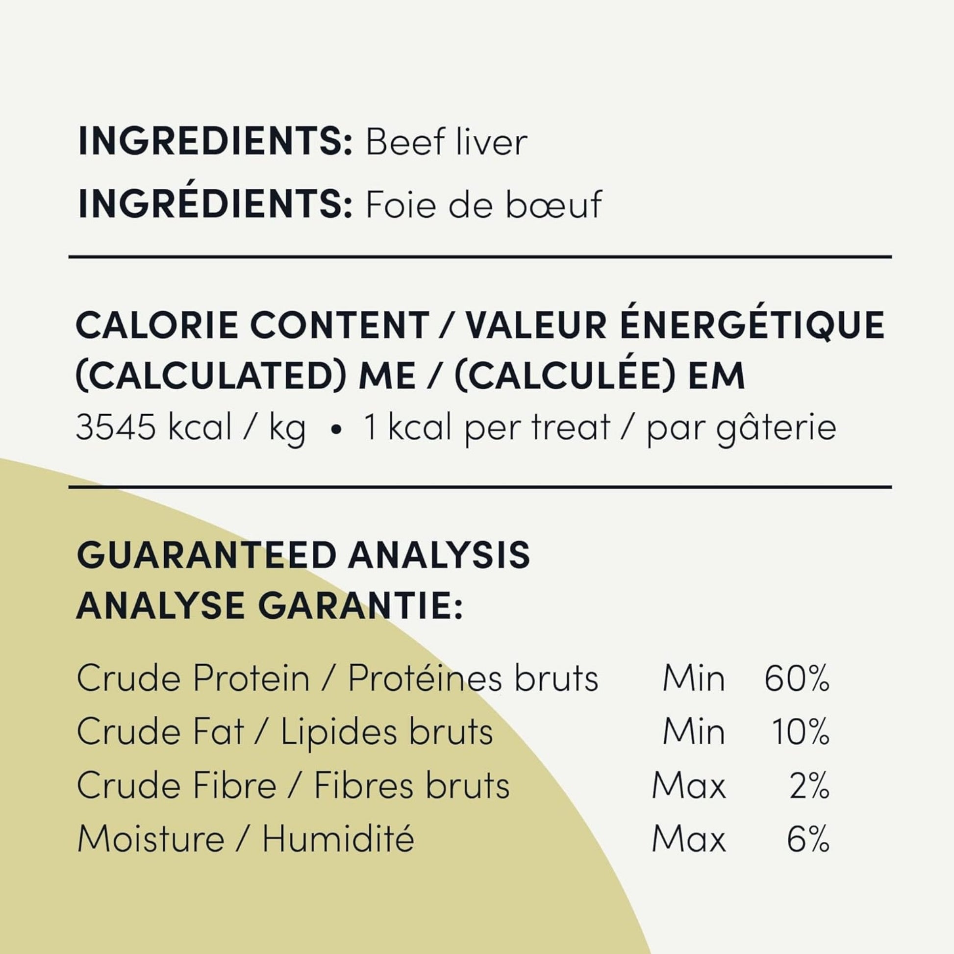 An all-natural single ingredient, grain-free treat made from fresh 100% North American beef liver that promises a high protein treats with easy digestibility and the convenience of a small bite size. Pure beef liver is freeze dried with no additives or preservatives to create a healthy protein treat that is perfect for all dogs and compliments a raw food diet. The freeze-drying process allows our freeze-dried liver to be packed full of nutrients and flavor that dogs love. This convenient size makes our Mini Trainers beef liver our number one seller as it's low calorie but packed with flavor.
