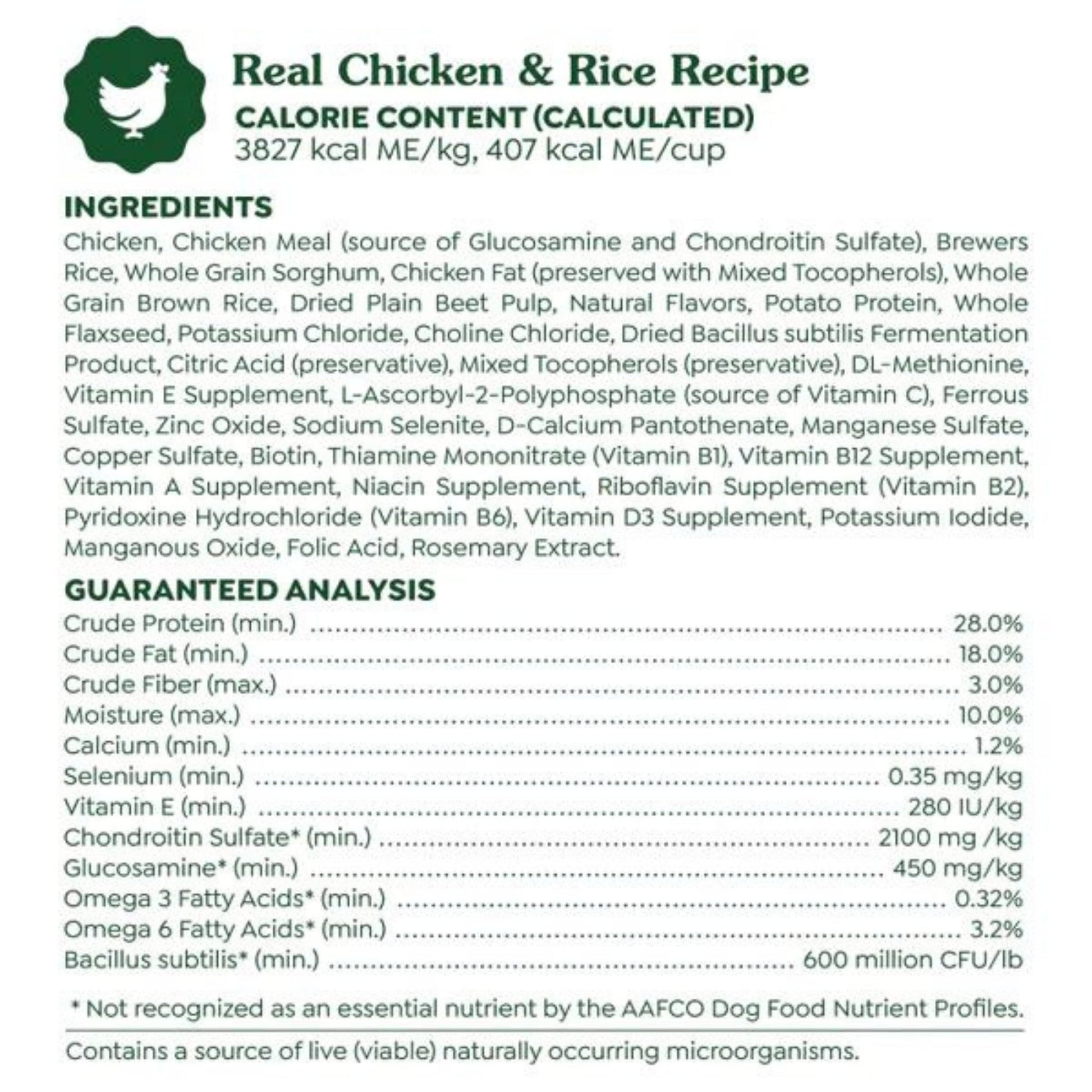 Chicken, Chicken Meal (source of Glucosamine and Chondroitin Sulfate), Brewers Rice, Whole Grain Sorghum, Chicken Fat (preserved with Mixed Tocopherols), Whole Grain Brown Rice, Dried Plain Beet Pulp, Natural Flavors, Potato Protein, Whole Flaxseed, Potassium Chloride, Choline Chloride, Dried Bacillus subtilis Fermentation Product, Citric Acid (preservative), Mixed Tocopherols (preservative), DL-Methionine, Vitamin E Supplement, L-Ascorbyl-2-Polyphosphate (source of Vitamin C), Ferrous Sulfate, Zinc Oxide, Sodium Selenite, D-Calcium Pantothenate, Manganese Sulfate, Copper Sulfate, Biotin, Thiamine Mononitrate (Vitamin B1), Vitamin B12 Supplement, Vitamin A Supplement, Niacin Supplement, Riboflavin Supplement (Vitamin B2), Pyridoxine Hydrochloride (Vitamin B6), Vitamin D3 Supplement, Potassium Iodide, Manganous Oxide, Folic Acid, Rosemary Extract.