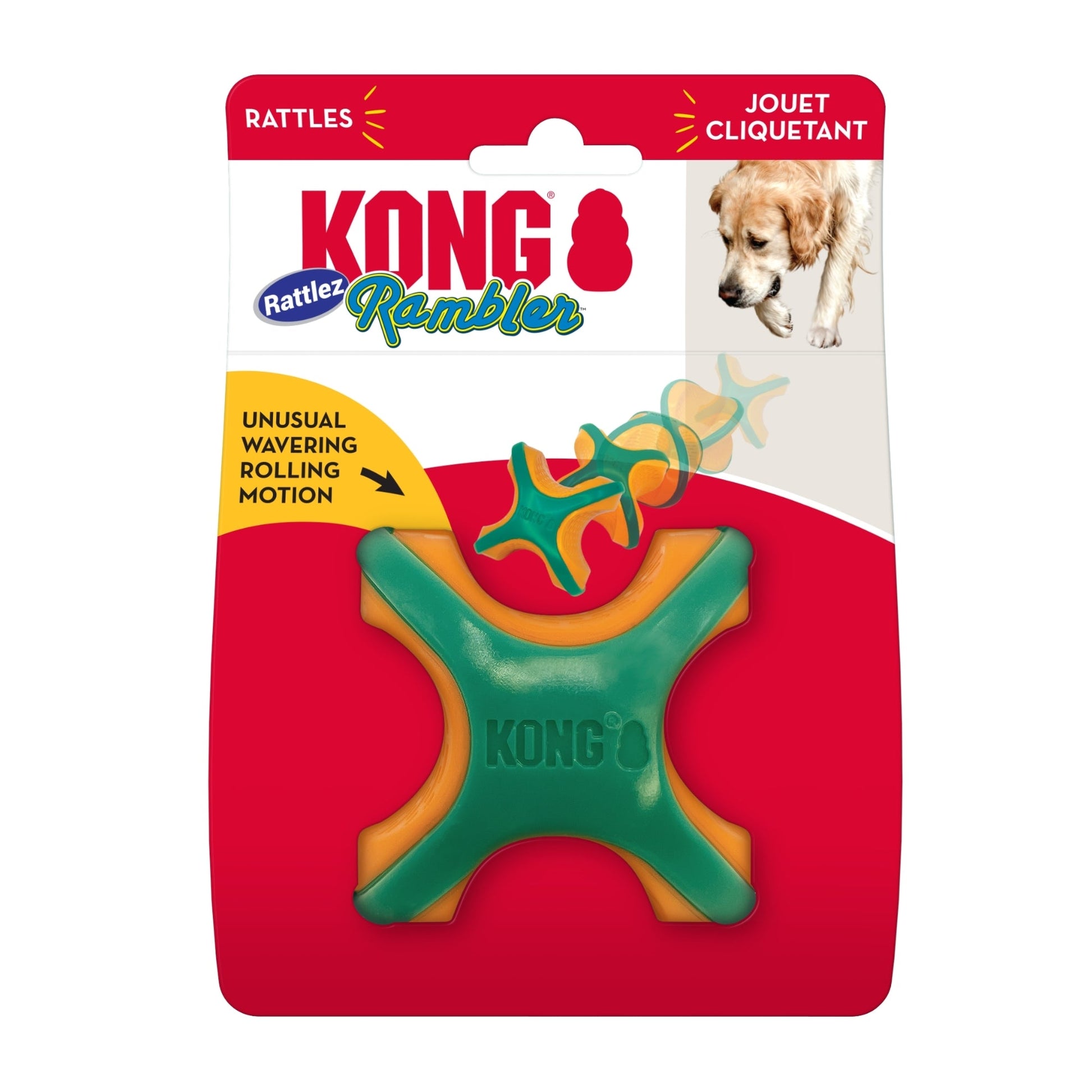 KONG Ramblerz Rattlerz’ quirky, wavering rolling action invites dogs to play. Durable construction ensures long-lasting fetch-and-chew action that satisfies natural instincts. Rattle keeps dogs playing for tons of healthy interactive play—indoors and out.