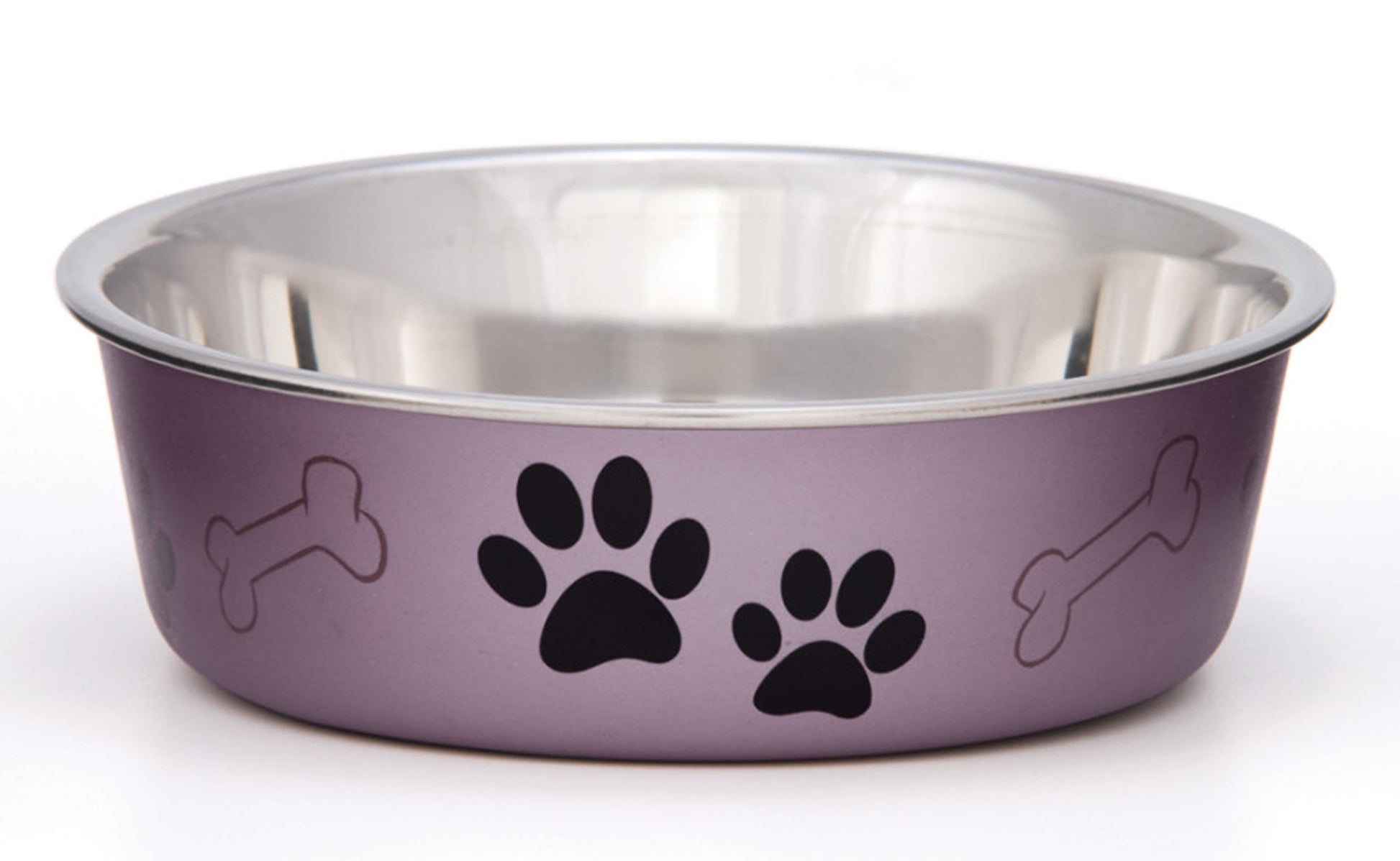 Loving Pets Products-Merlot Bella Bowl. Pawprints and bones imprints in the background are a great design for cats, dogs or pets! Size Small has no bone imprint. Vet recommended stainless steel to resist bacteria. Removable rubber base prevents skids, spills and noise. Dishwasher safe (remove rubber ring before washing). This package contains one 1-pint pet dish. Imported.