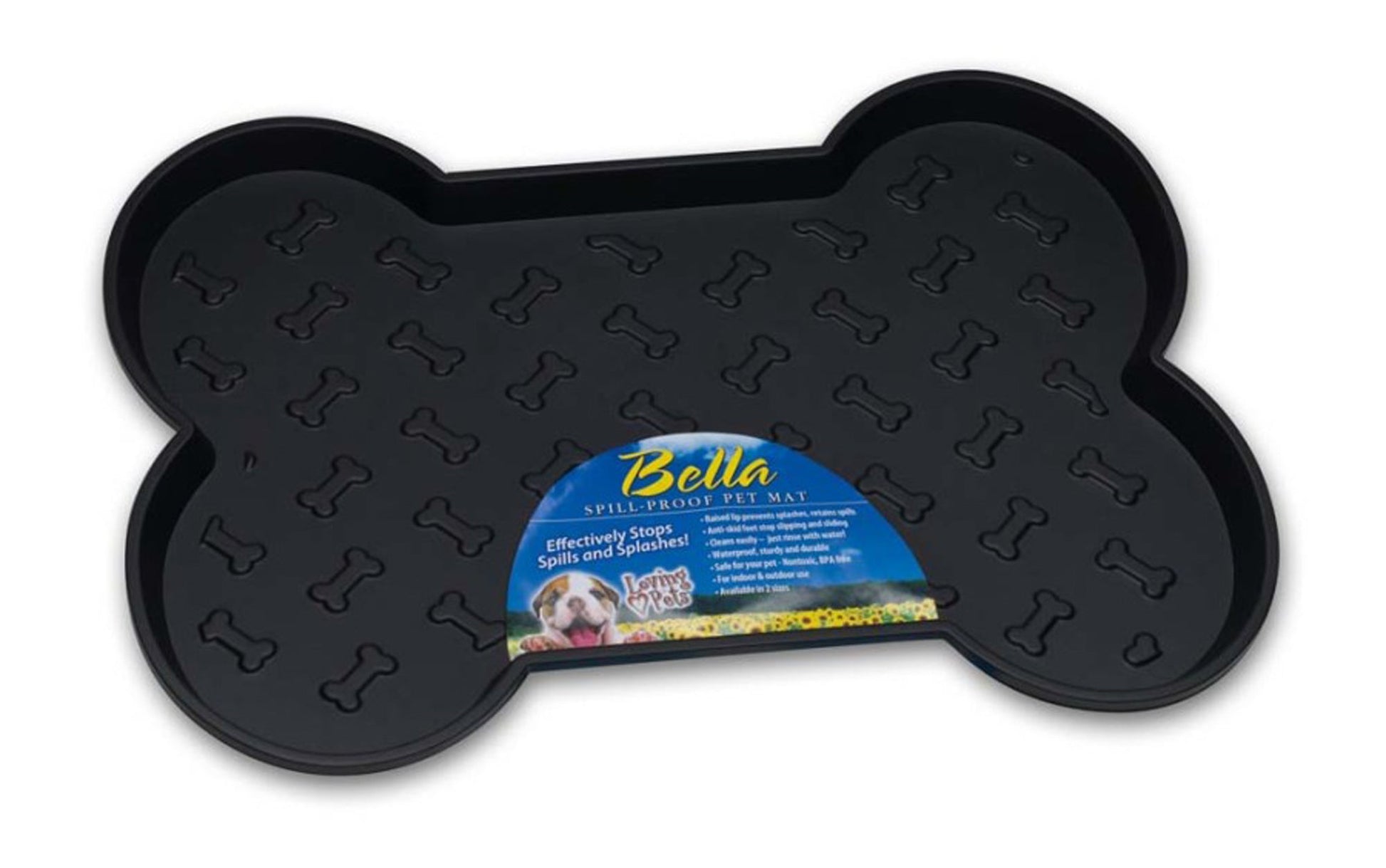 Bone-shaped Bella Spill-Proof Dog Mats stylishly prevents splashes and retains spills. Bella Spill-Proof Dog Mats have raised edges for maximum spill capacity, a slip-resistant, bone-embossed surface, and anti-skid feet to prevent slips, slides, noise and floor damage. Non-toxic, BPA-free and quality tested. For both indoor and outdoor use. Cleans easily – just rinse with water.
