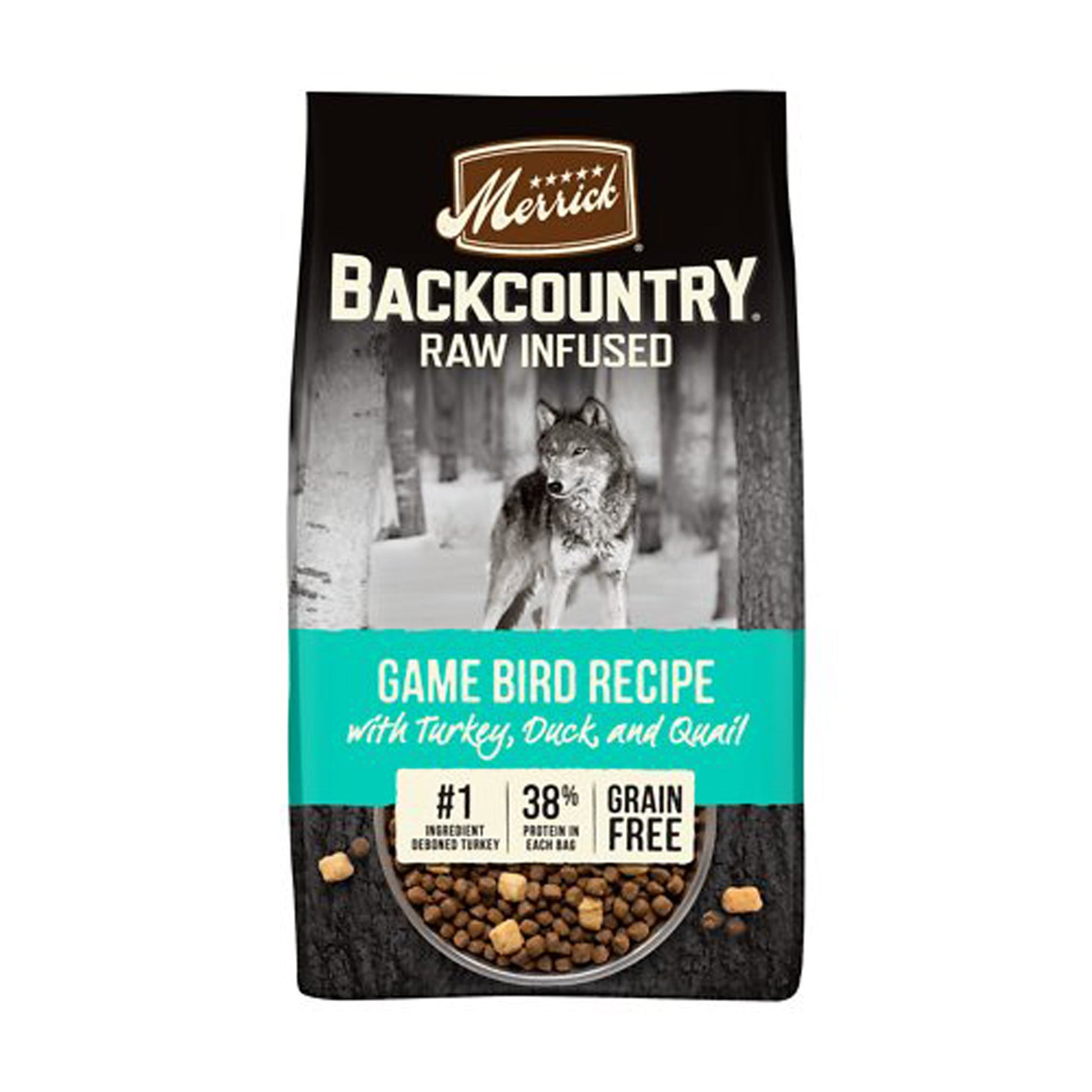 Give your fluffy friend a new food blend with Merrick Backcountry Raw Infused Grain Free Dry Dog Food Game Bird Recipe. This freeze-dried dry food for dogs features real deboned turkey as the very first ingredient. It's combined with duck and quail in a protein-rich and highly-digestible formula. This grain-free dry dog food contains freeze-dried raw-coated kibble and freeze-dried raw bites to give your buddy all the benefits of a raw diet. Its developed with high levels of omega fatty acids to help promote healthy skin and a shiny coat while glucosamine and chondroitin support hip and joint function. Its paw-fect for helping all breeds of adult dogs build healthy muscles and maintain a high level of energy throughout the day.