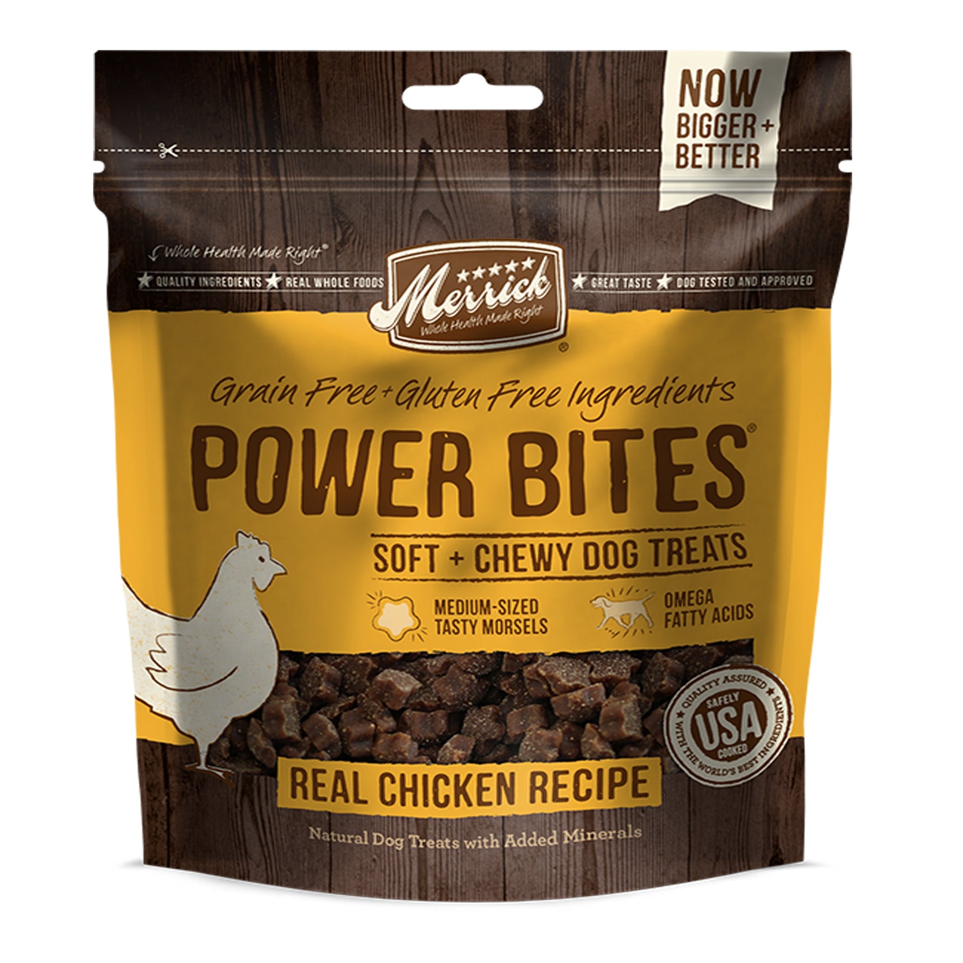 Merrick Power Bites are all-natural, soft and chewy treats with big taste and industry-leading levels of protein packed into every bite. Perfect for rewarding or training, your dog is sure to love Power Bites! Real deboned meat is always the first ingredient. This high-quality protein helps build and maintain healthy muscle tissue and energy levels; Gluten free and grain free. No artificial flavors, colors, or preservatives; All Merrick recipes are crafted in our Hereford, TX kitchen and cooked in the USA, in facilities that uphold strict FDA guidelines