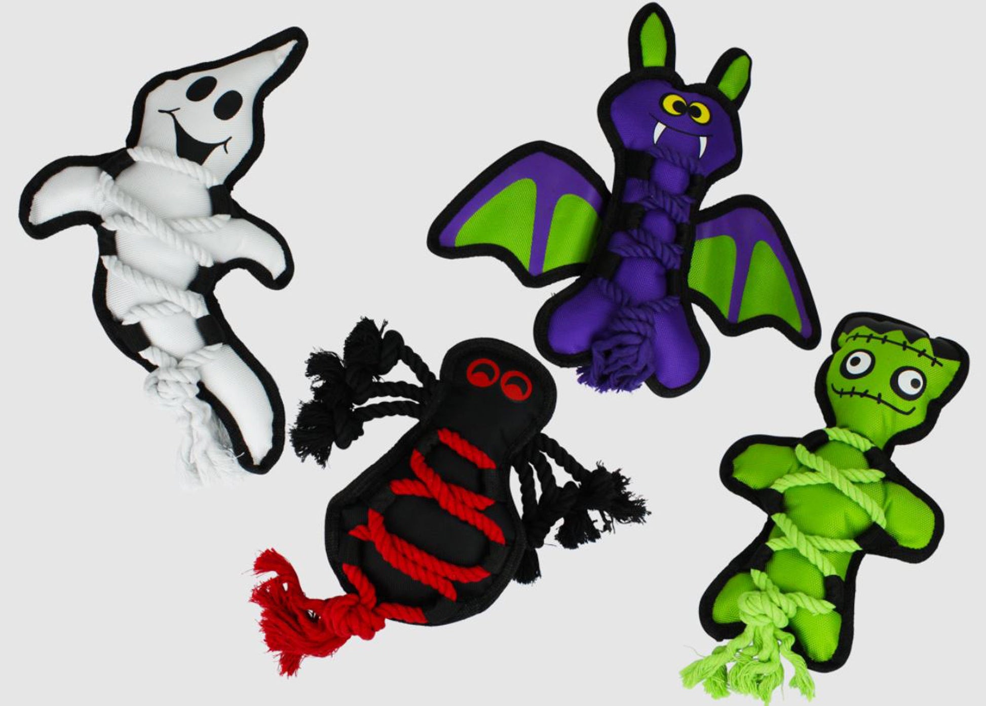 Dogs go batty for our durable ballistic-style nylon Halloween toys that float and squeak! Features a cotton rope for tugging.