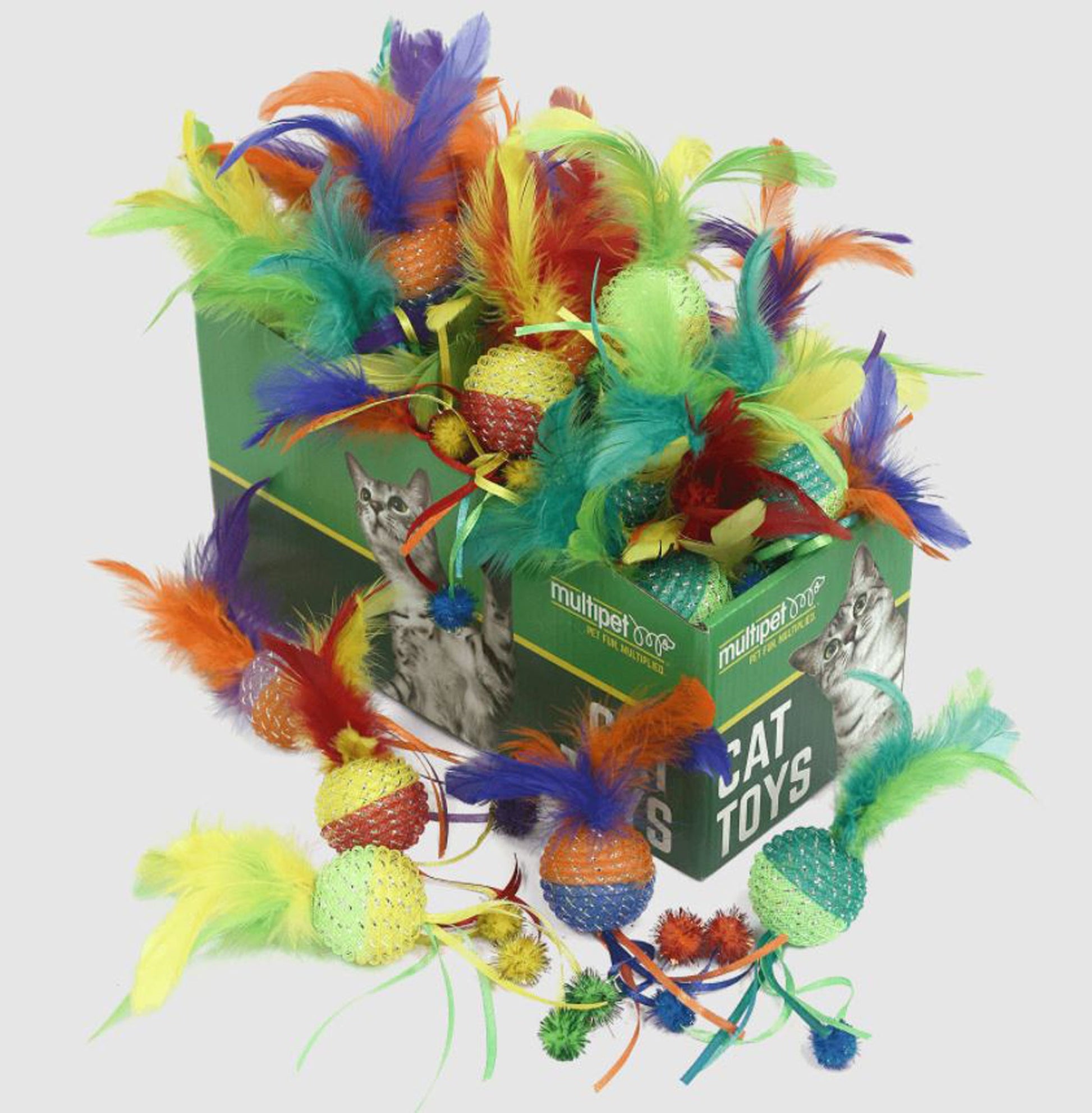 Mesh Ball cat toys are a glittery combination of mesh, feathers and ribbons that will attract cats and encourage play. They are lightweight making them easy to toss and bat. Cats will love the texture and natural feathers. This PDQ is available as a 30 piece. br/>Sold in Quantity of:1