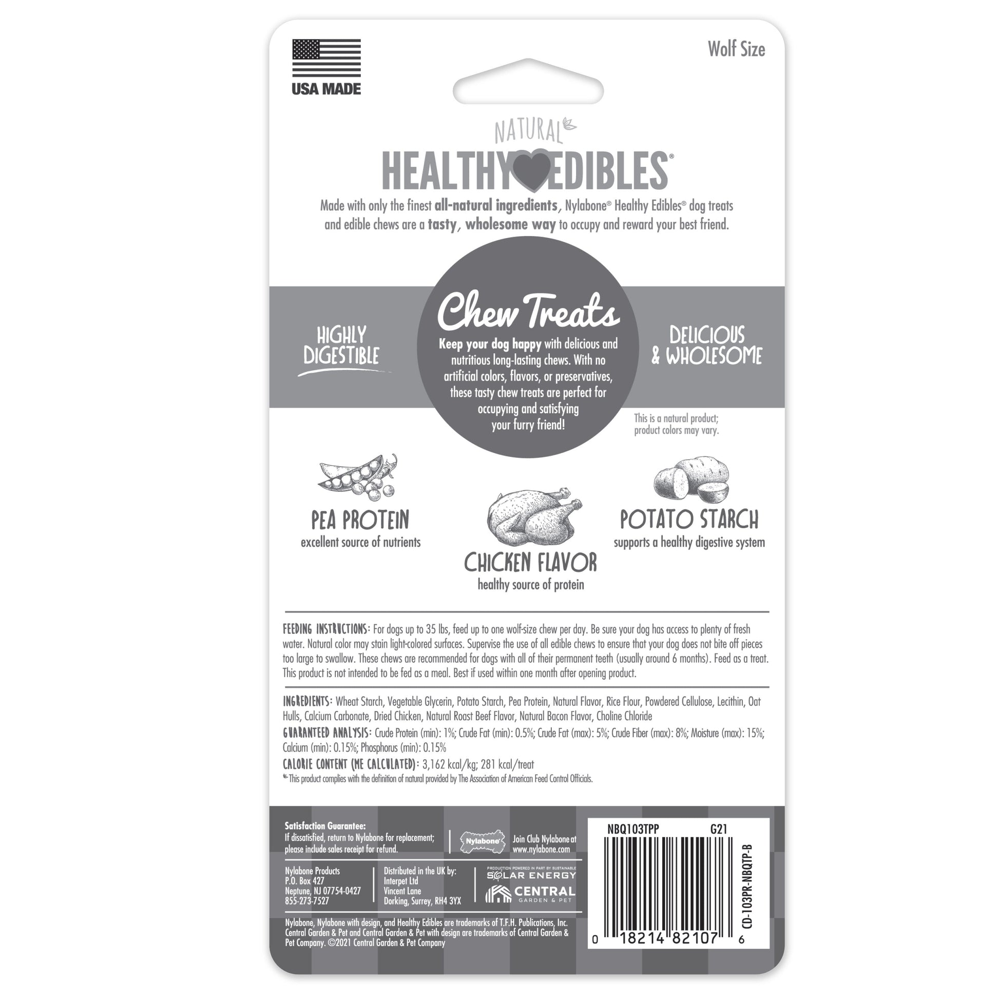 Wholesome eating begins with Healthy Edibles. Our USA-made Healthy Edibles Chicken Dog Treats are packed with tail-wagging chicken flavor that dogs just cant resist. These healthy dog treats are made with natural and contain added vitamins and minerals. The longer-lasting, highly digestible formula satisfies dogs who love to chew and is free from added salt, sugar, and artificial preservatives. Theres a size for every dog, so indulge your puppers craving no matter how big or small they may be. Whether youre occupying or treating, our chew treats will let your pooch know theyve been a good dog! MADE WITH NATURAL AND ADDED VITAMINS & MINERALS Natural dog treats feature added vitamins and minerals|HEALTHY DOG TREATS Rich in amino acids to help support immune system and joint & bone health|LIMITED INGREDIENT FORMULA Chew treats contain no artificial flavors, no colors, and no preservatives|MADE IN THE USA Our long lasting dog chew treats are proudly made in the United States br/>Sold in Quantity of: 1