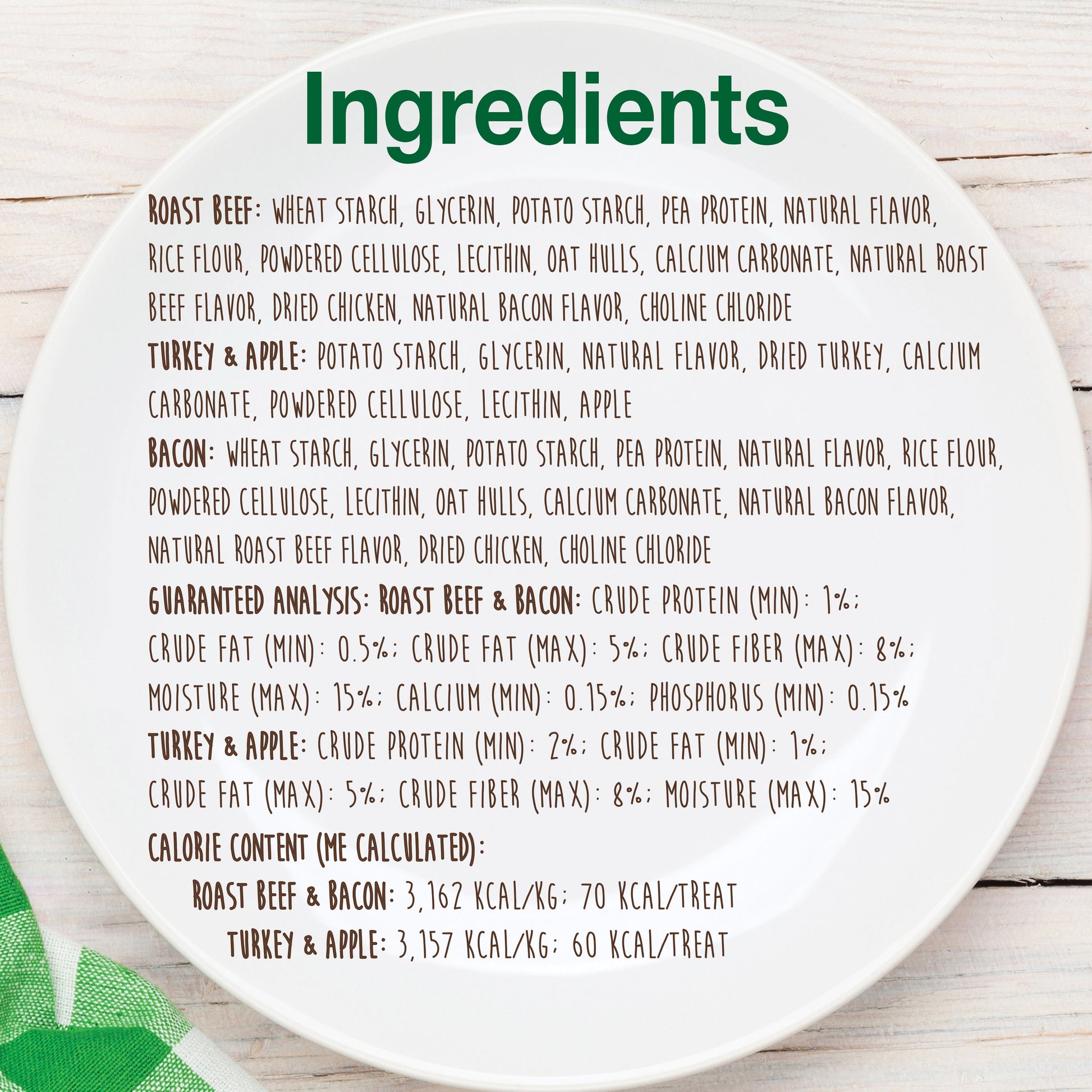 Petite-size chew treats for puppies|Wholesome bacon, roast beef, and turkey & apple flavors your pup will love|Chew treat dimension Out of package measures 3.81" long x 1.06 " wide x 0.63" high