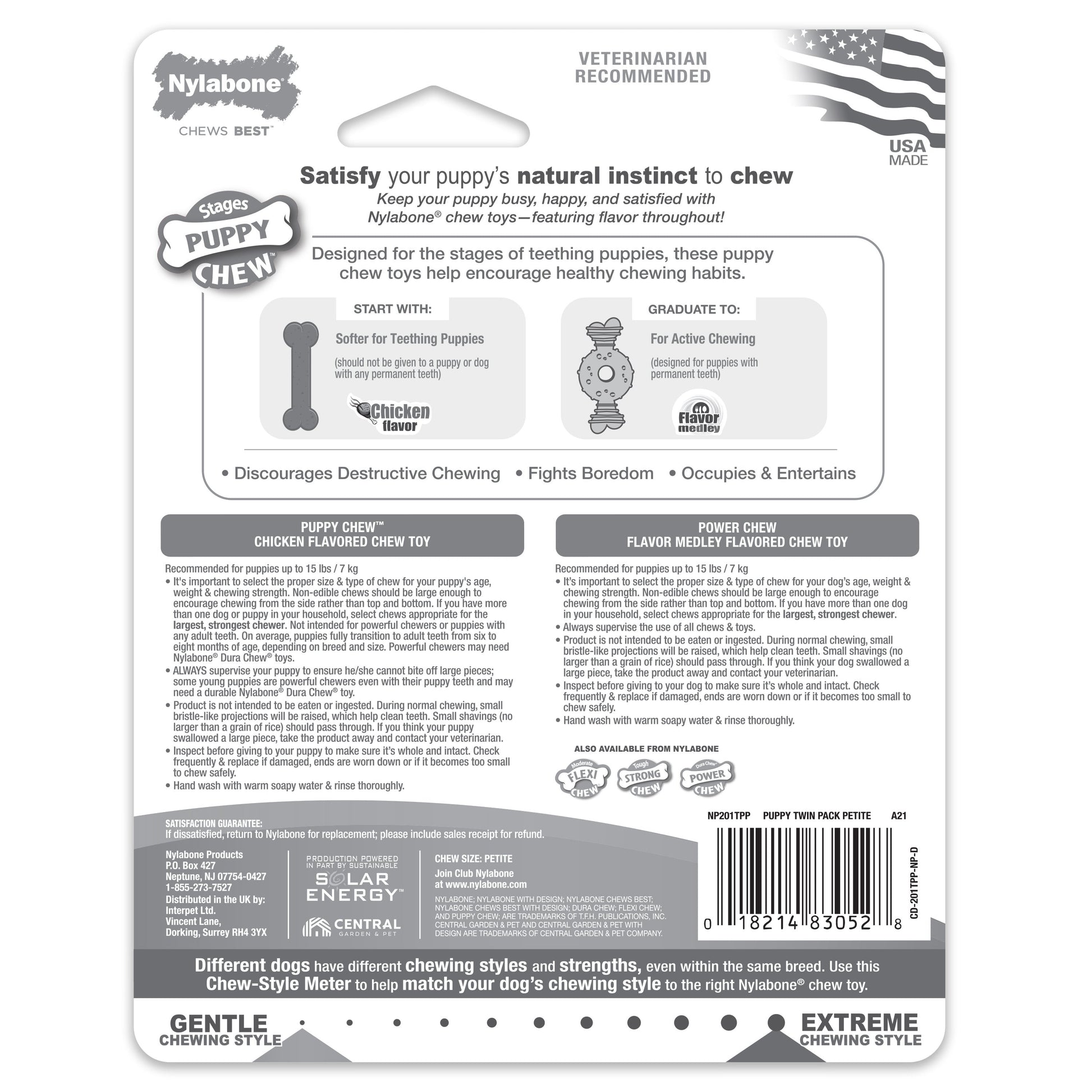 Treat your new family member to this perfect combination of puppy toys! This value pack includes two long lasting chew toys designed to encourage positive chewing habits, containing savory chicken and flavor medley taste throughout. The first puppy toy is made of softer, flexible material made just for teething puppies! The second is a durable nylon bone for your puppy to chew when he has all of his adult teeth. Both toys help promote clean teeth and discourage destructive chewing. These chew toys are the perfect pastime for your teething puppy! Color may vary. PROMOTES DOG DENTAL HEALTH Ridges and nubs help prevent plaque and tartar buildup as puppies chew|PROMOTES POSITIVE CHEWING HABITS - Satisfies puppies natural instinct to chew and discourages destructive chewing|MADE IN THE USA Dog chew toy is proudly made in the United States br/>Sold in Quantity of: 1