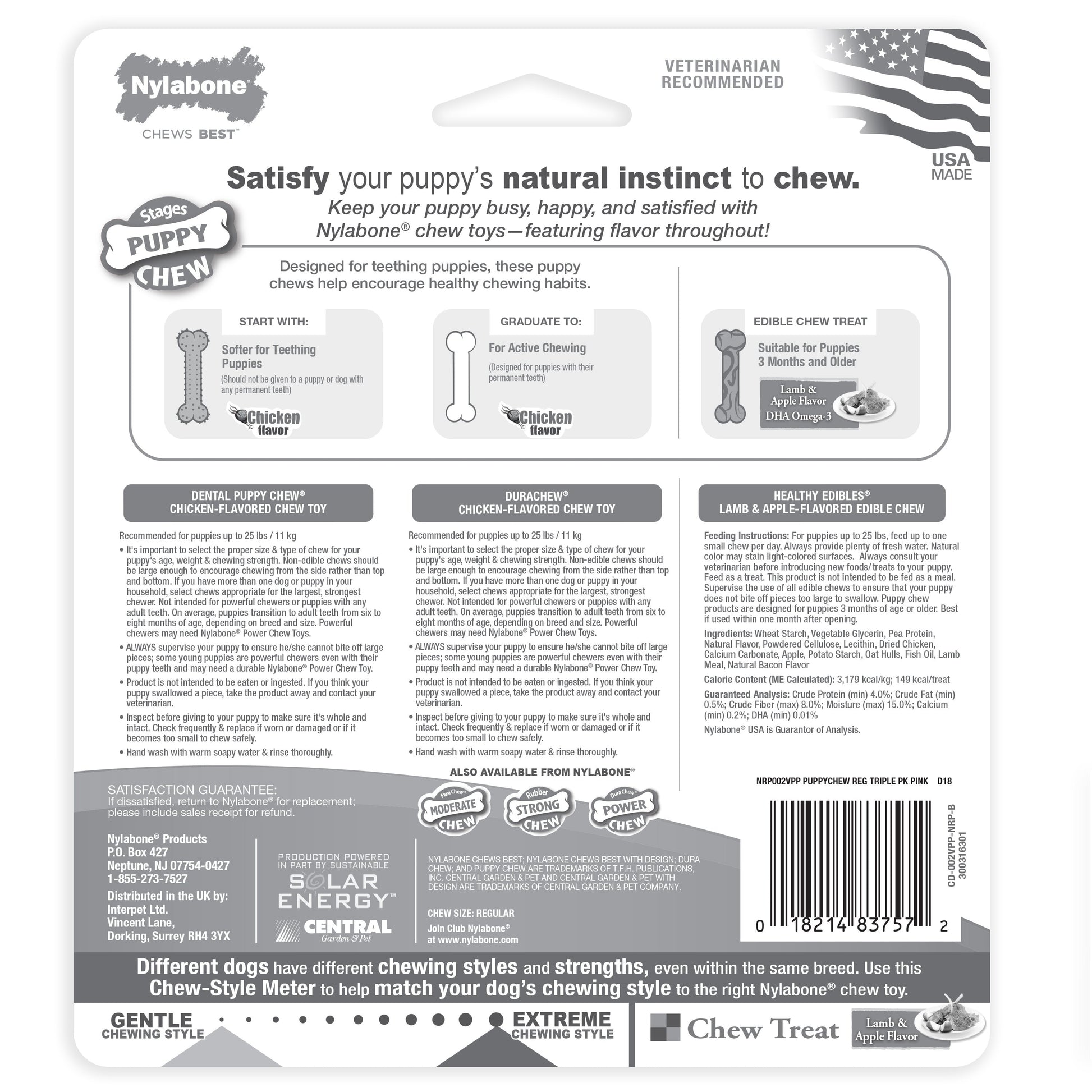 Introduce your puppy to the Nylabone family of products and develop healthy chewing habits right from the start! The Puppy Chew Toy and Treat Starter Pack includes a soft, chicken-flavored Puppy Bone for teething puppies, a Power Chew DuraChew chicken-flavored bone for puppies starting to get their permanent teeth, and a Healthy Edibles lamb & apple puppy treat just for puppies 6 months and older.Wheat Starch, Vegetable Glycerin, Pea Protein, Natural Flavor, Powdered Cellulose, Lecithin, Dried Chicken, Calcium Carbonate, Apple, Potato Starch, Oat Hulls, Fish Oil, Lamb Meal, Natural Bacon Flavor"