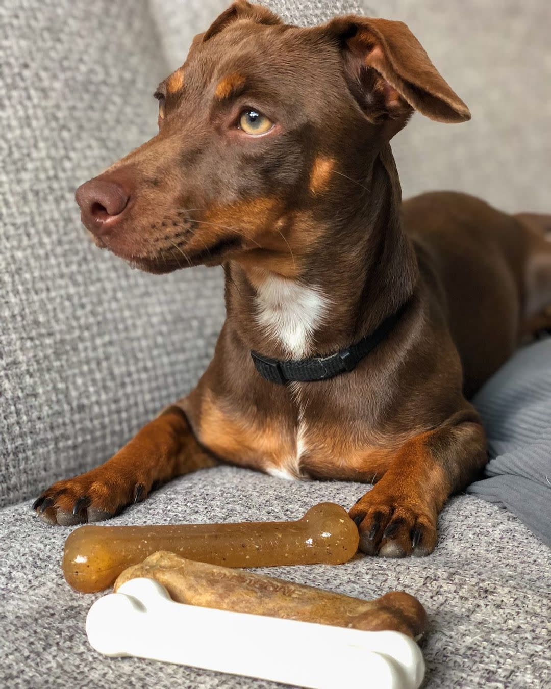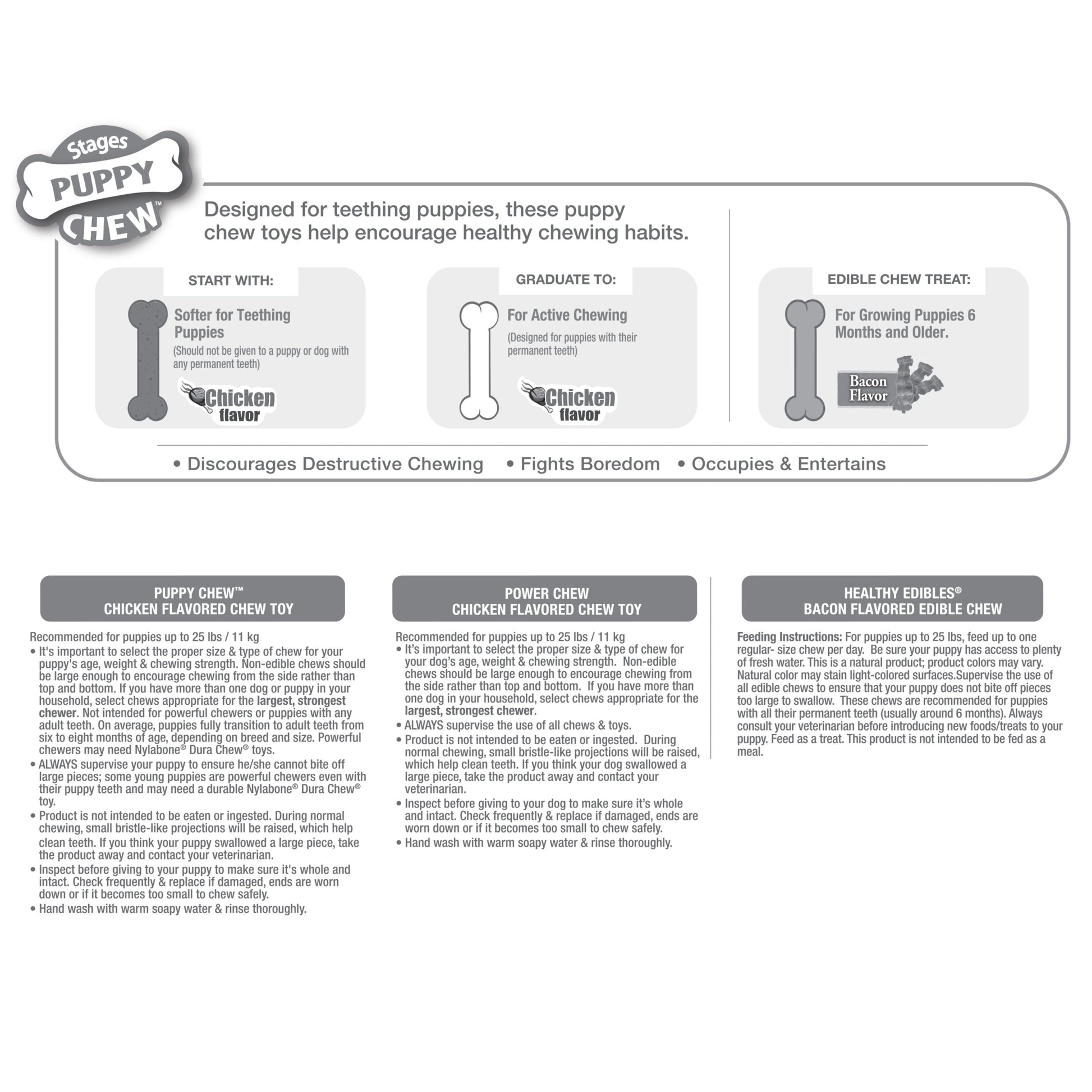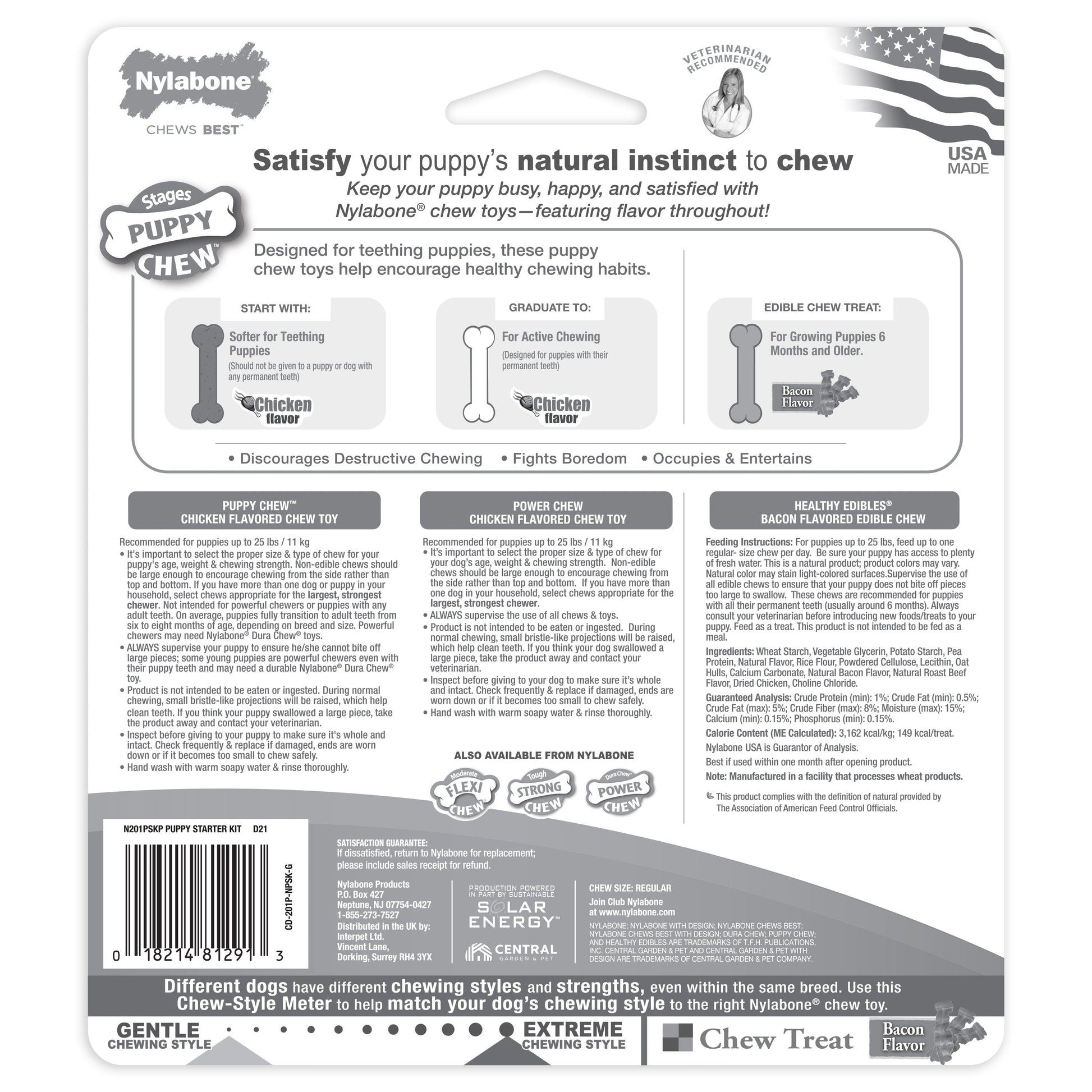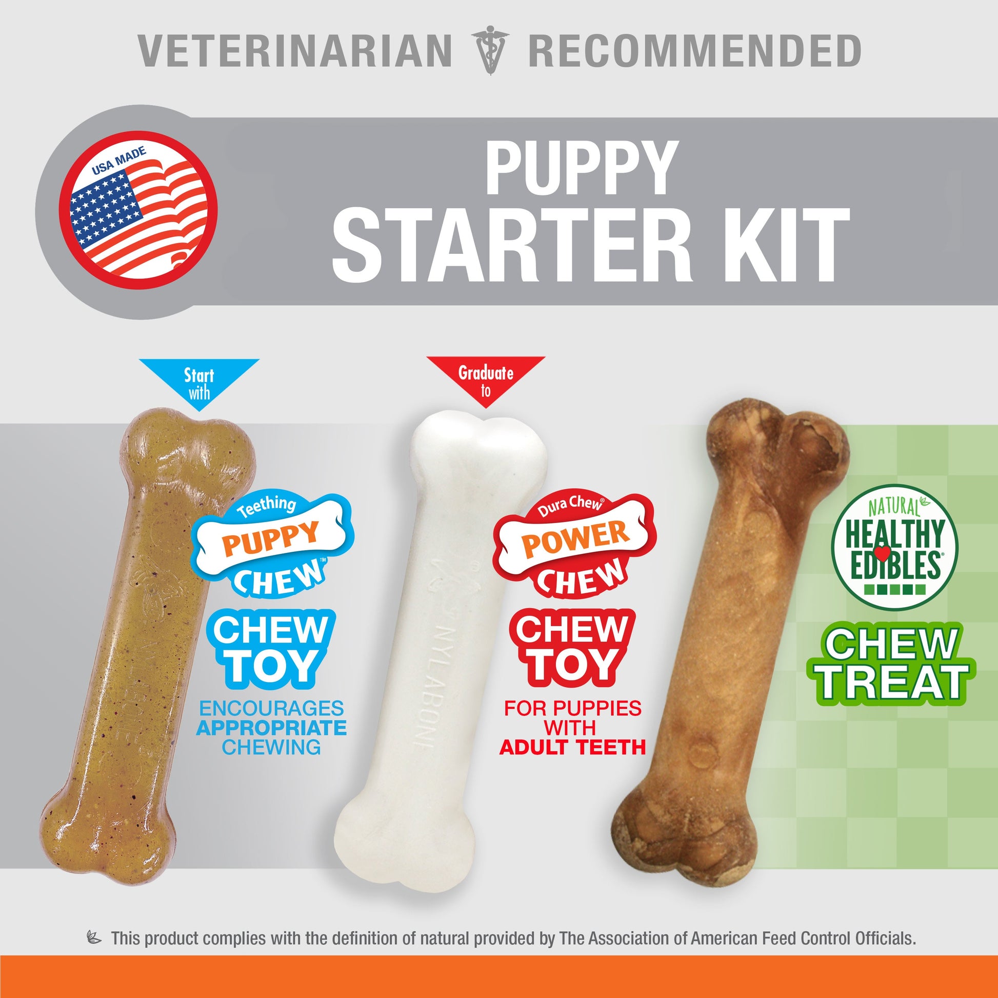 As the pet industry leader for over 60 years, Nylabone understands dogs are born with a natural urge to chew! Encourage your furry friend to develop appropriate chewing habits from a young age with our Puppy Starter Pack. This pack features two puppy chew toys and one chew treat. Start with the flexible chicken flavored chew toy made from softer material for teething or gentle-chewing puppies who do not yet have any adult teeth. Then, graduate to the durable bacon flavored chew toy for powerful puppies or puppies with their adult teeth. For a tasty and wholesome reward, the pack is complete with a delicious Natural Nubz dog chew treat. Start your new pal off on the right paw with these veterinarian-recommended puppy chews that are made in the USA! SOFTER PUPPY CHEW TOY - Designed for puppies without adult teeth, the chicken flavored bone gently soothes gums during teething|DURABLE CHEW TOY - Long-lasting bacon flavored bone ideal for powerful puppies or pups with adult teeth|HEALTHY CHEW TREAT - Turkey and sweet potato flavored chew treat includes DHA Omega-3, flaxseed, and calcium for growing pups|SUPPORTS DOG ORAL HEALTH - Chew toys help reduce plaque and tartar as puppies chew|USA MADE Dog chews are proudly crafted in the United States br/>Sold in Quantity of: 1