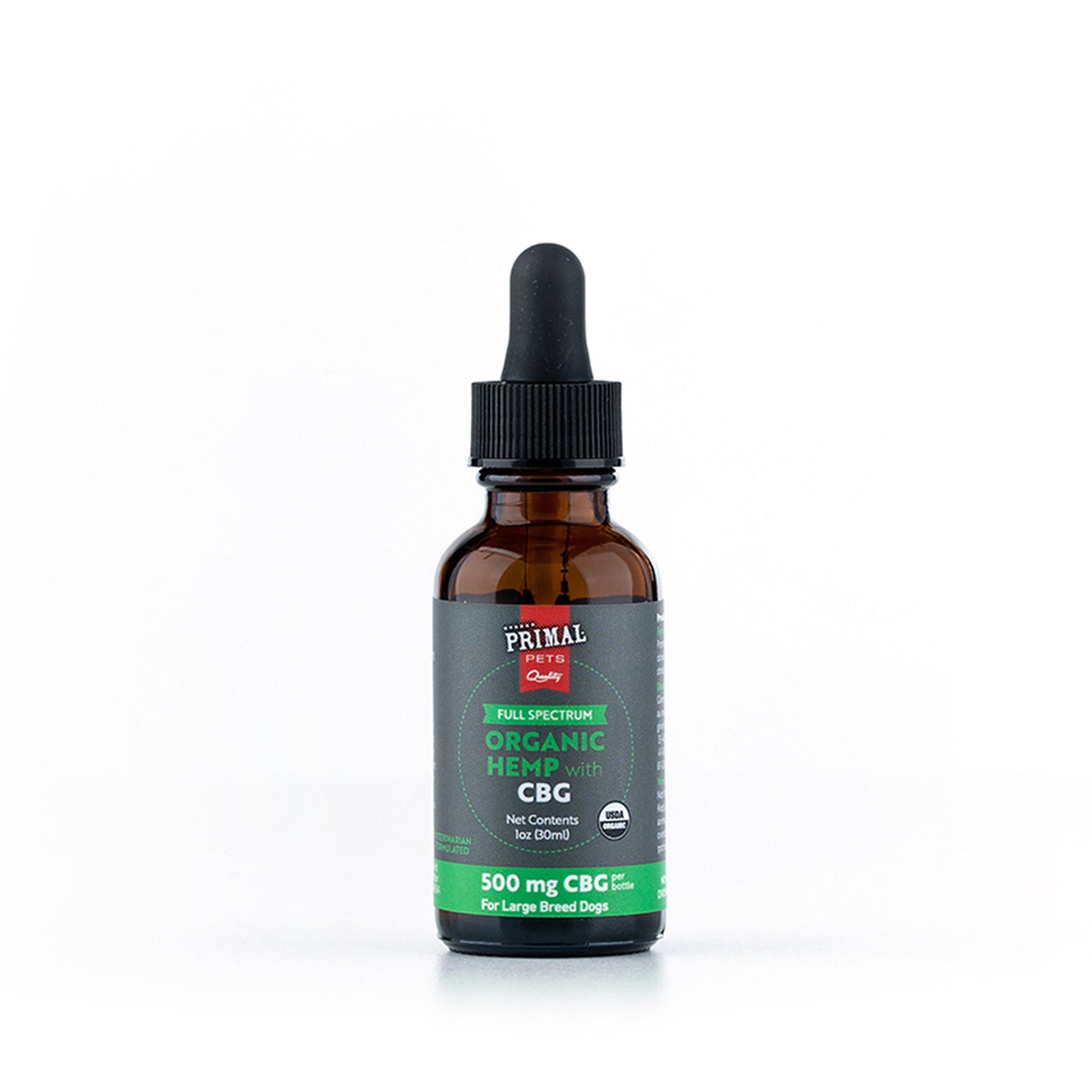 Primal 500 mg Organic Full Spectrum Hemp Oil with CBG for Large Dogs. Features: Promotes relaxation without drowsiness. Helps manage normal stress. Supports the urinary tract. USDA Organic