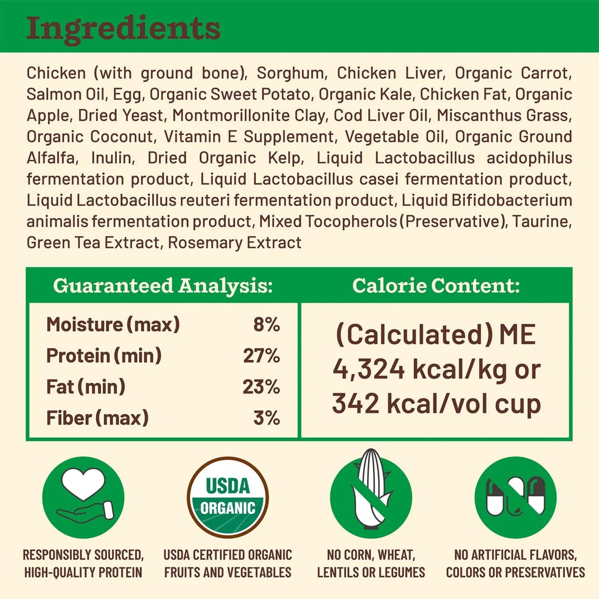 Chicken (with ground bone), Sorghum, Chicken Liver, Organic Carrot, Egg, Organic Sweet Potato, Salmon Oil, Organic Kale, Chicken Fat, Organic Apple, Dried Yeast, Montmorillonite Clay, Miscanthus Grass, Organic Coconut, Cod Liver Oil, Vitamin E Supplement, Vegetable Oil, Organic Ground Alfalfa, Inulin, Dried Organic Kelp, Liquid Lactobacillus acidophilus fermentation product, Liquid Lactobacillus casei fermentation product, Liquid Lactobacillus reuteri fermentation product, Liquid Bifidobacterium animalis fermentation product, Mixed Tocopherols (Preservative), Taurine, Green Tea Extract, Rosemary Extract