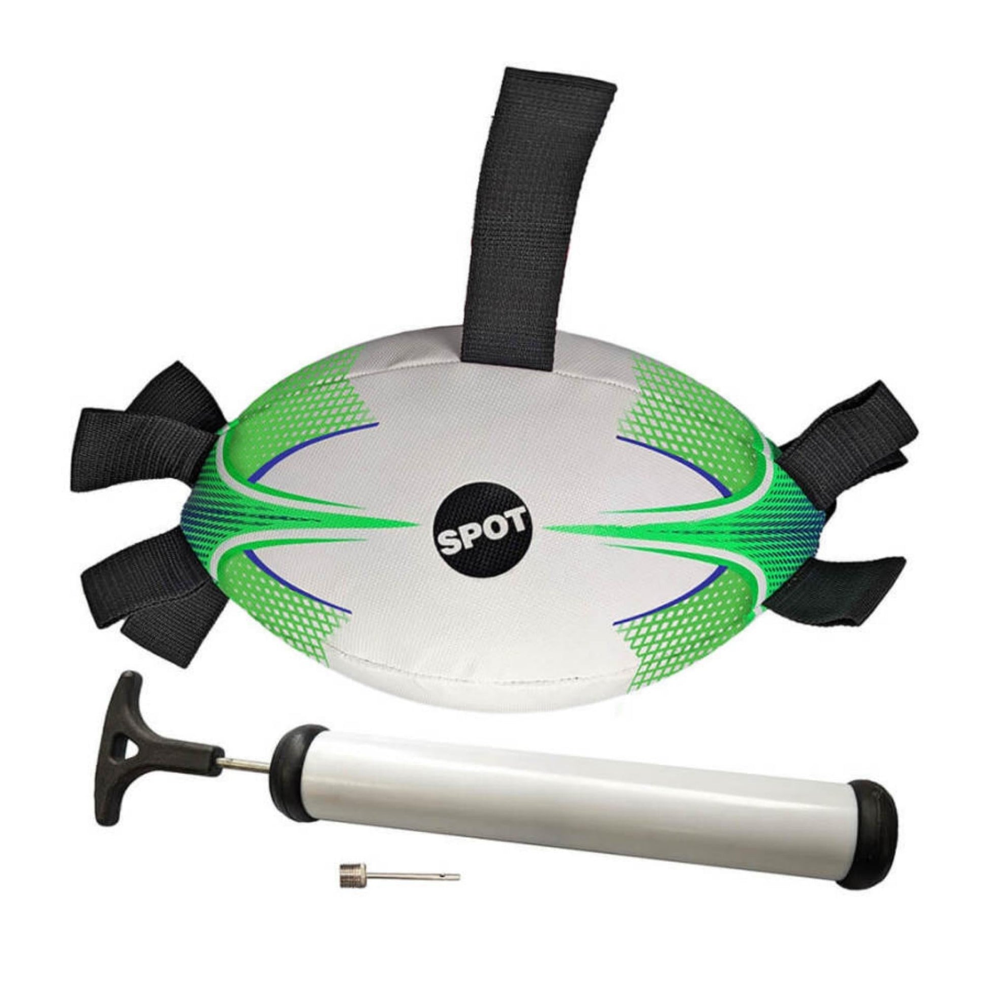 Our Spot Football with EZ tabs is an interactive dog toy made for active lifestyles. Perfect for yards, parks, lakes, pools and the beach. Durable nylon tabs all around the ball are easy for dogs to grab and tug.One larger tab for human hands to grab and toss. Pump included!