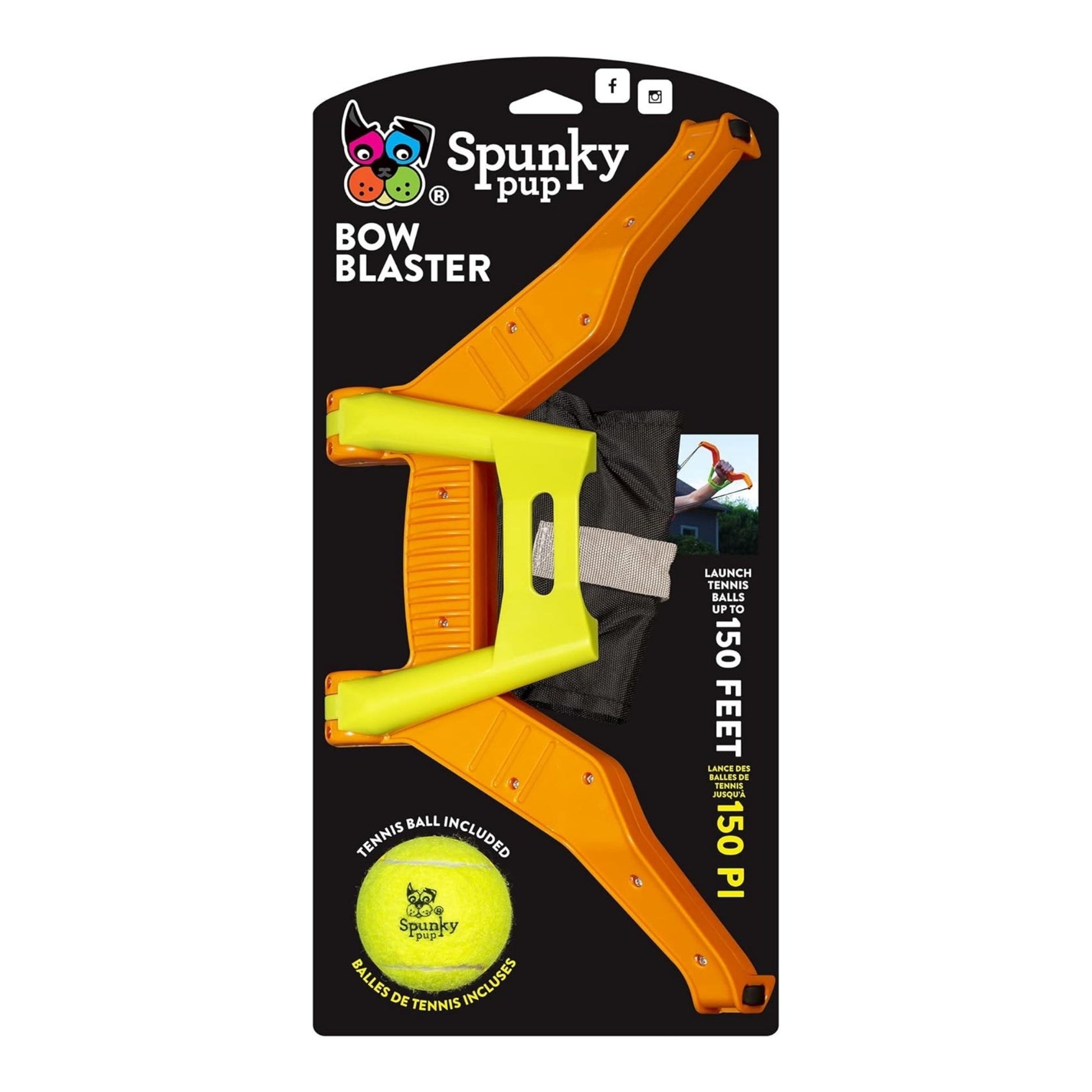 Reach the pawpular level with the Spunky Pup Bow Blaster! Exercise even the most energetic pup with this nifty launcher – it sends balls sailing up to 150 feet and can fit virtually any toy in its launching pouch. Folding down for easy storage, it's sure to be your pup's new favorite way to play, no matter their preference - it's great for right- or left-pawed pups! Get ready to make fetching a whole new ball game.