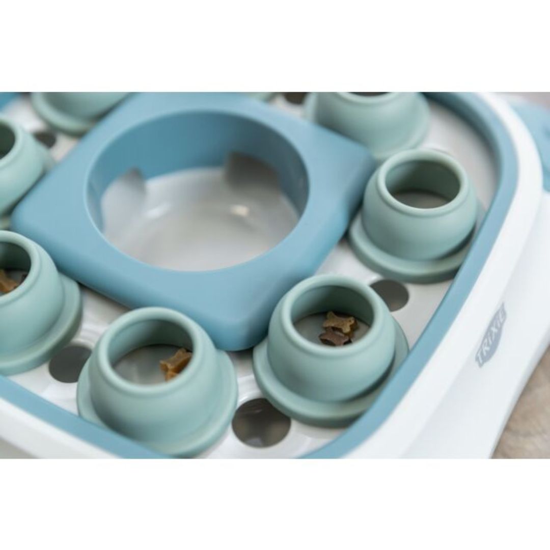 pet earns reward by sliding the compartments. The treats would fall into the inner bowl or the outer covered lids