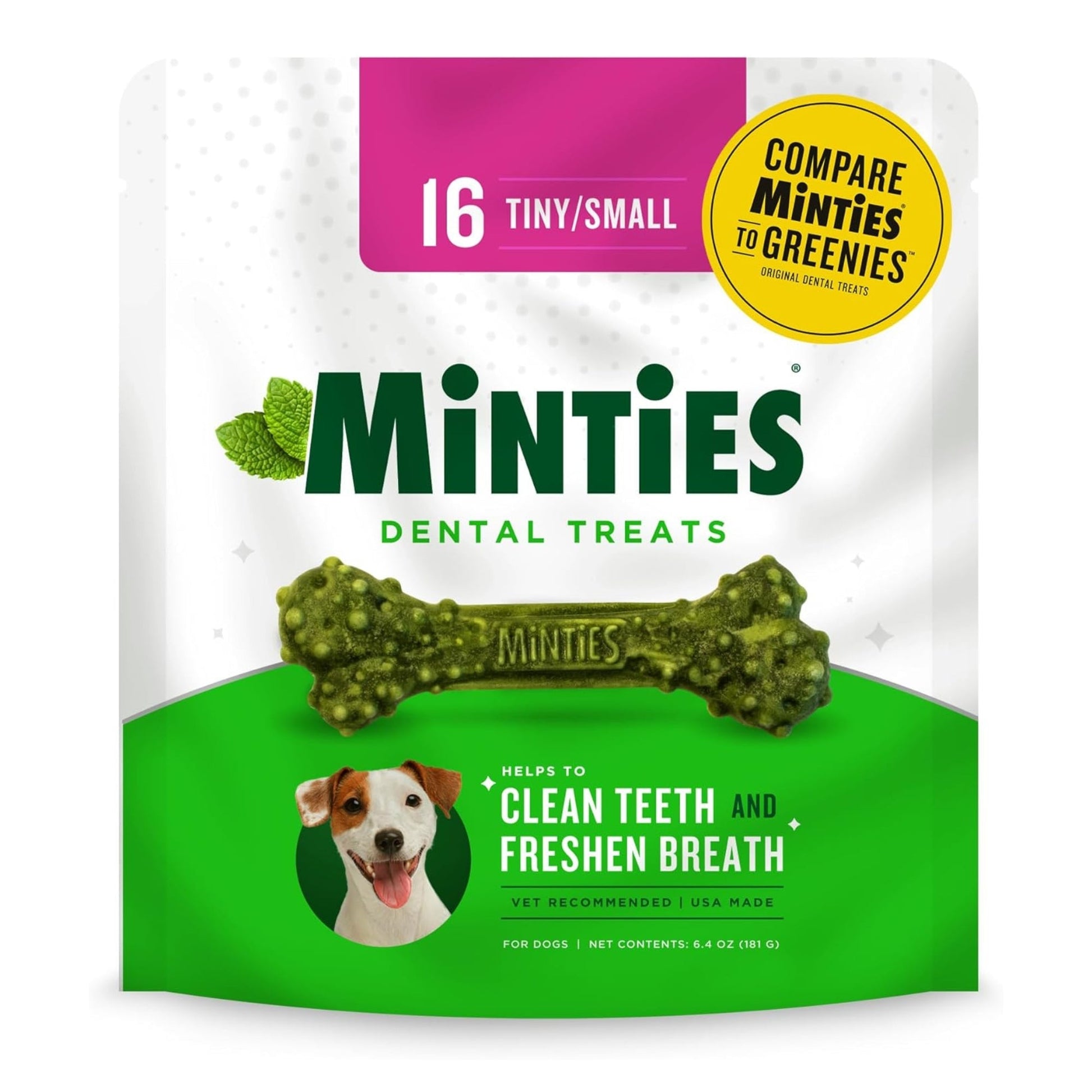 One Minties Dog Dental Treat is all it takes to start dog teeth cleaning and freshening, and to help remove plaque and tartar